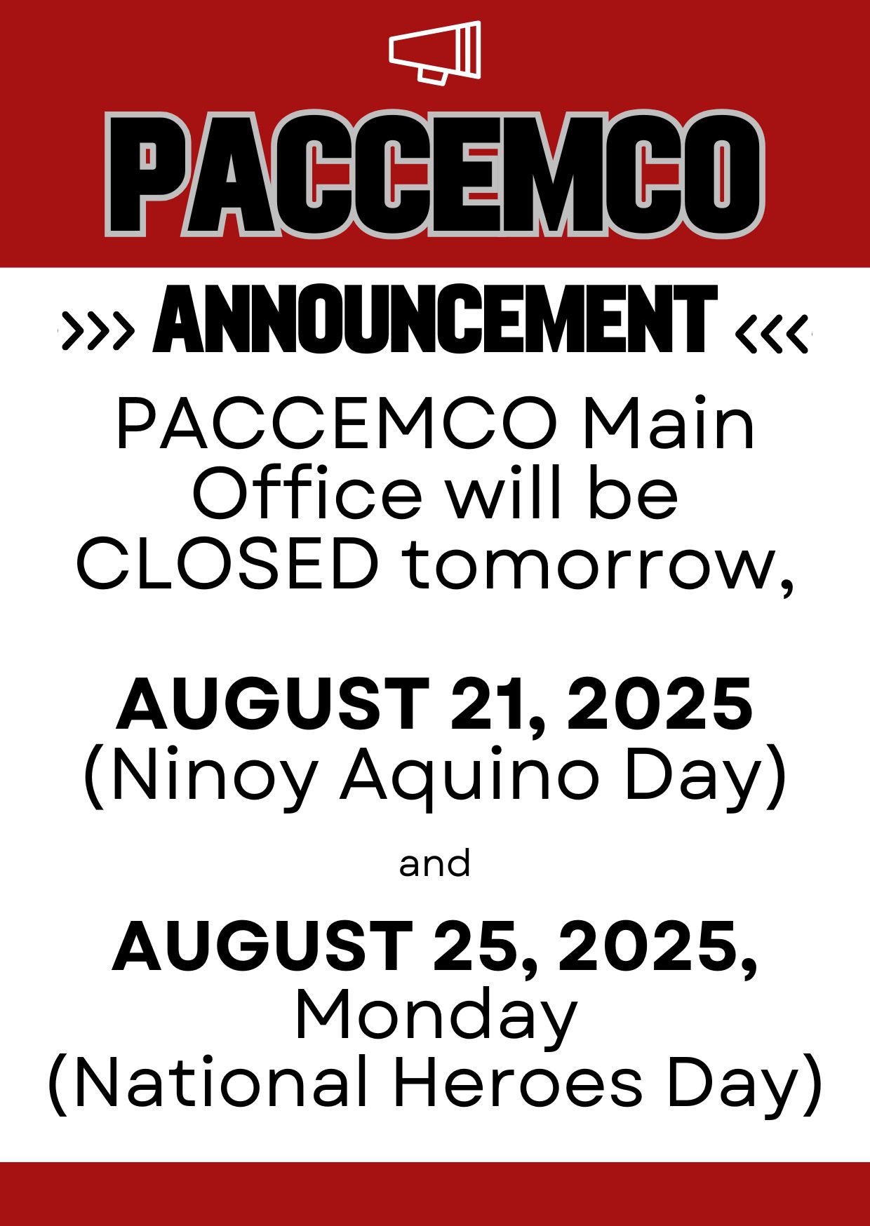 PACCEMCO Main Office Will be Closed, tomorrow, August 21, 2025 (Ninoy Aguino Day), and August 25, 20...